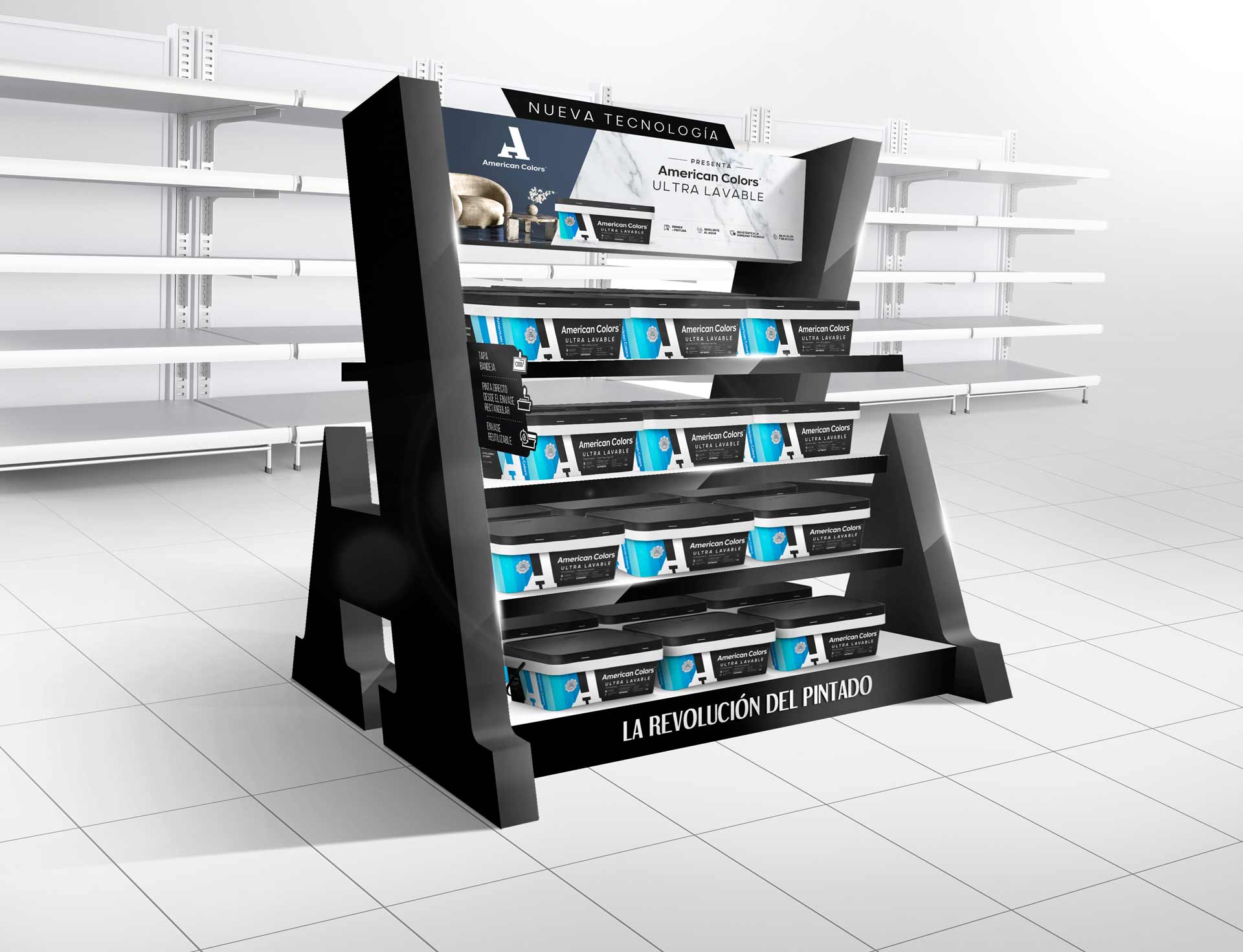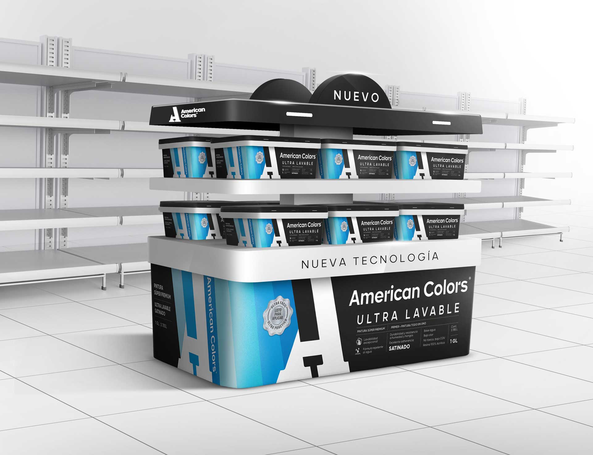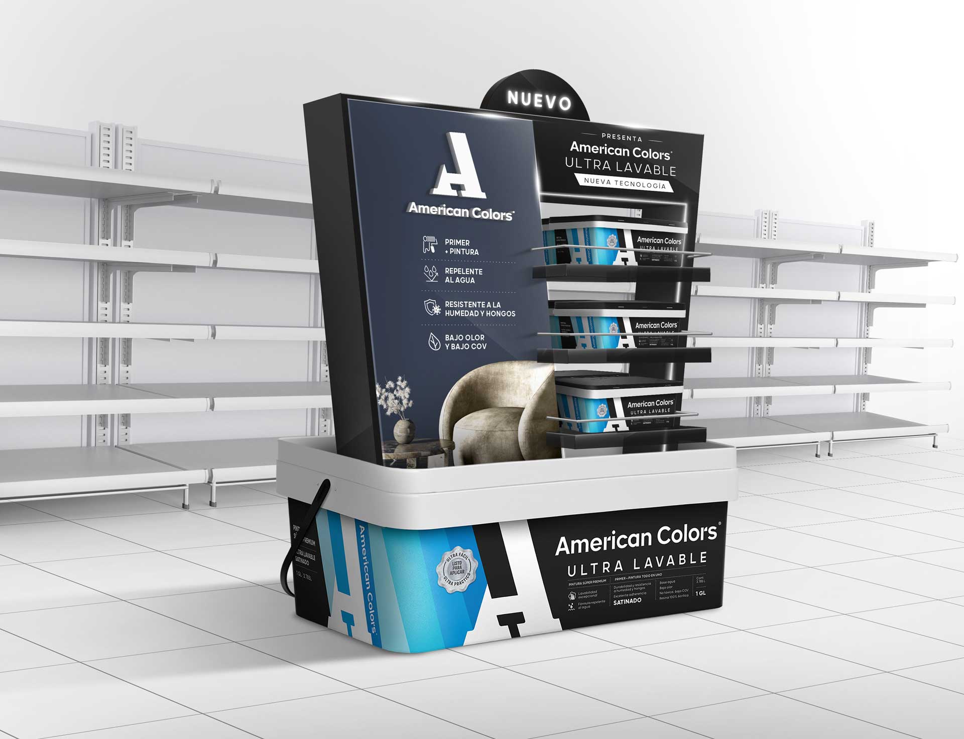 Para ello, creamos tres elementos disruptivos donde el balde y la identidad visual de American Colors se convirtieron en protagonistas, logrando una composición moderna, equilibrada y visualmente impactante.
